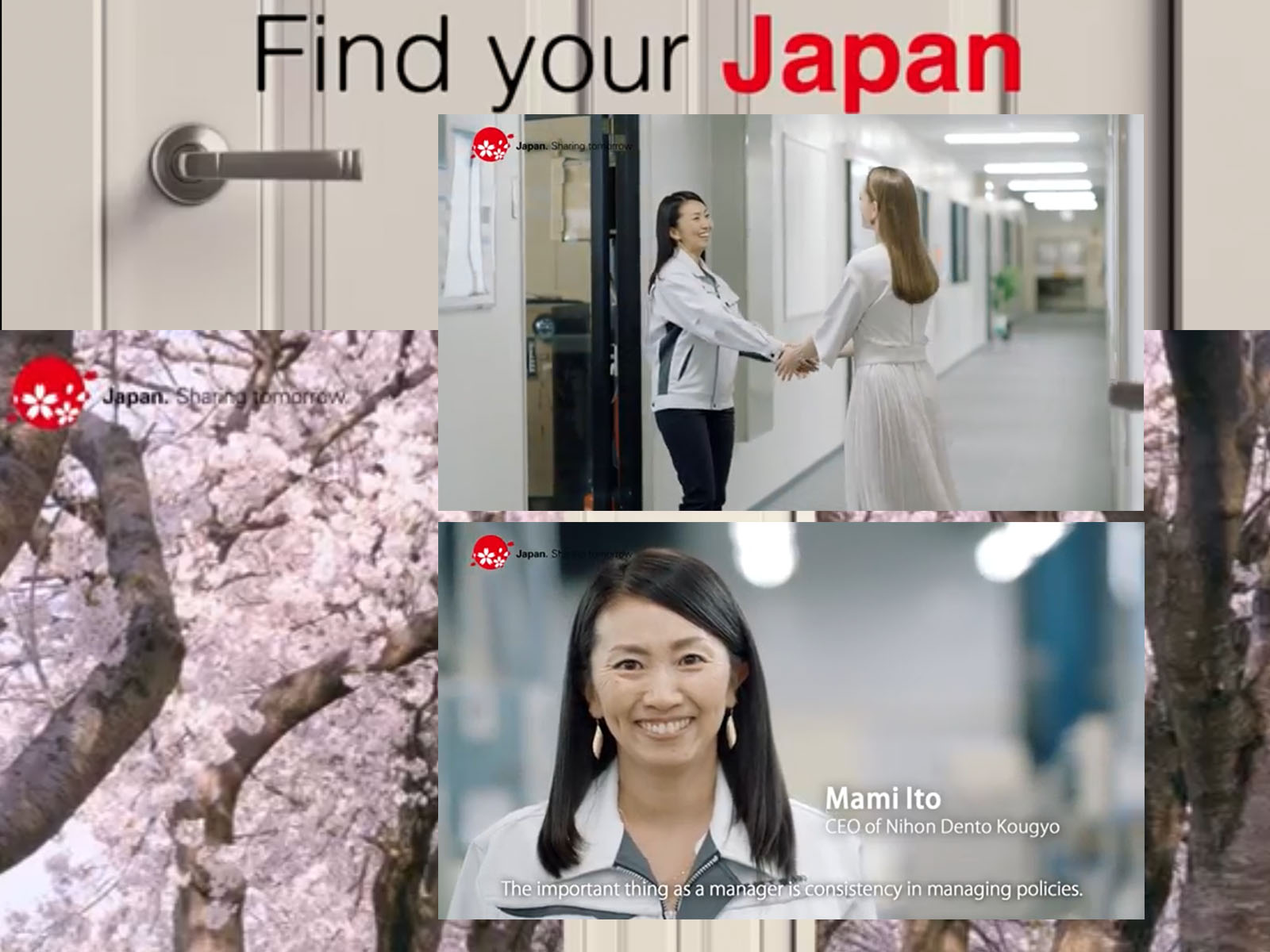 内閣府の海外向けの日本紹介CM『Find your Japan:The Land of Rising Women』に代表取締役 伊藤をはじめ、弊社社員が出演いたしました。是非、お時間のあるときにでも、ご覧いただければと存じます。