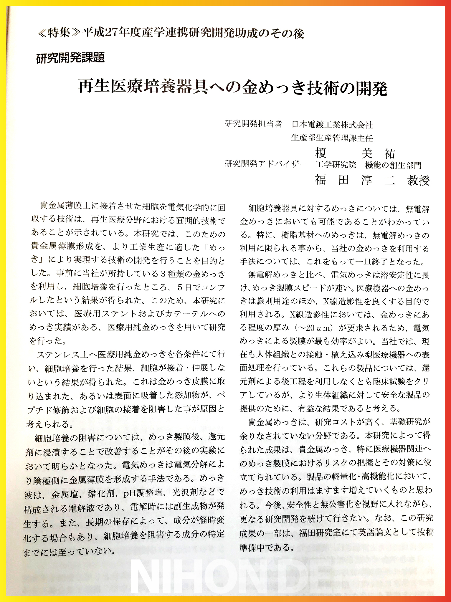 『横浜工業会だより』第31号(平成30年7月)に弊社の「再生医療培養器具への金めっき技術の開発」が掲載されました。