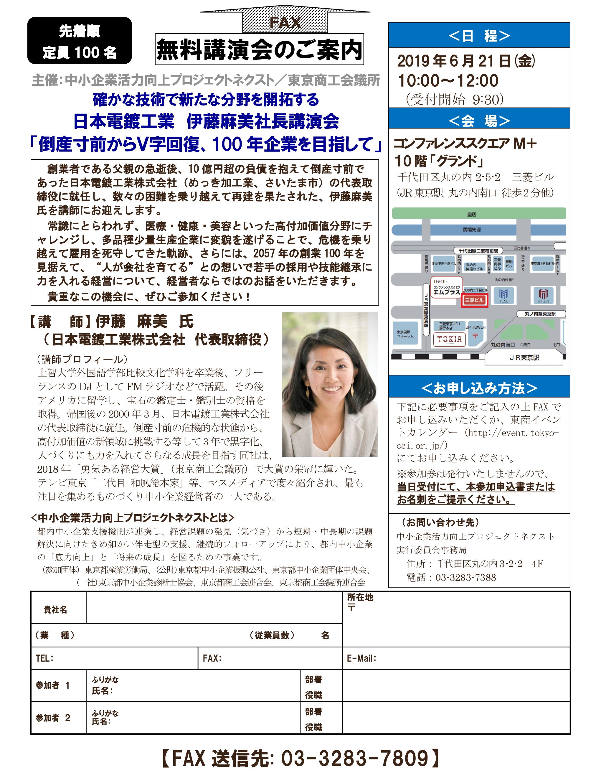 2019年6月21日(金)に『コンファレンスM+(JR東京駅より徒歩2分)』にて、代表取締役の伊藤の無料講演会がございます(主催:中小企業活力向上プロジェクト/東京商工会議所)。「倒産寸前からV字回復、100年企業を目指して」というテーマでお話をいたします。是非お時間がございましたら、ご参加ください。